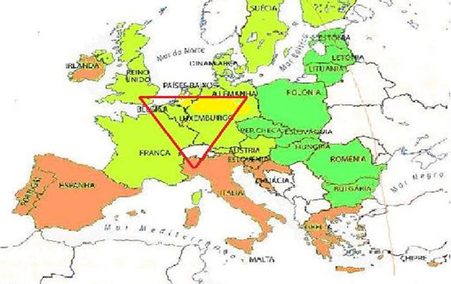 O mapa seguinte evidencia as duas periferias, o Centro e dentro do triângulo a área onde reside o poder económico e político na Europa e que, naturalmente não se cinge apenas aos estados formalmente pertencentes à UE. Com o Brexit, Londres não vai deixar de ser a principal praça financeira do mundo cabendo a Paris, a maior do Continente, apenas um modesto 20º lugar; e a Suíça também não vai perder o sistema financeiro ali instalado ou algumas indústrias avançadas.