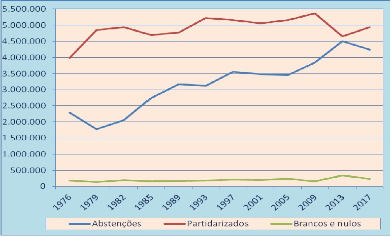 estabilidade no volume dos votos partidarizados e um ligeiro aumento dos votos